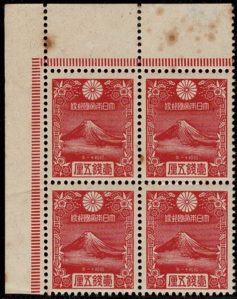 JAPÃO – * 226 – Quadra, canto superior esquerdo da folha – 140 Euros…
