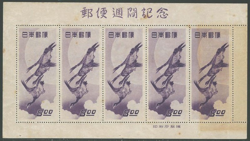 JAPÃO – (*) 437 (Patos) Mini folhas com 5 exemplares. Último (5º selo) com mancha de ferrugem e não contado. Peça lavada, mas mesmo assim com pontos de ferrugem – 700 Euros para 4 selos isolados..