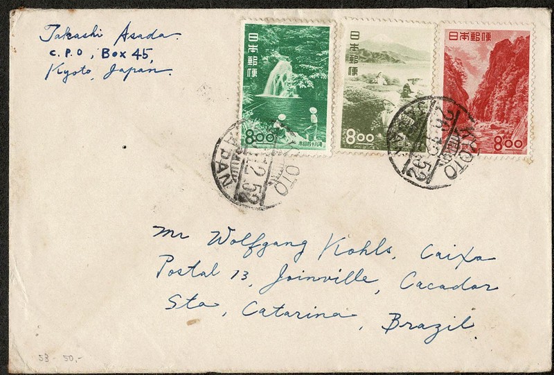 JAPÃO – Ano 1952 – Envelope circulado para Santa Catarina, com chegada. Selos Yvert 465, 474 e 494. Peça com micro furo de broca.