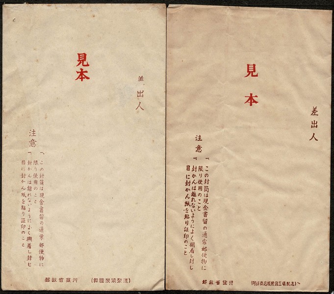 JAPÃO – 2 envelopes sem uso, oficiais do correio para remessa de dinheiro. Diferentes caracteres e ambos com carimbo vermelho “Amostra” – Anos 10 ?.