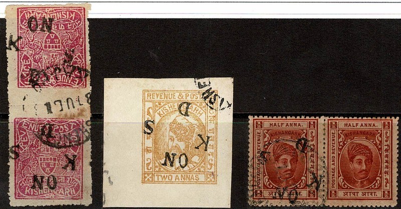 KISHENGARH (Estado Principesco da India) – ◉ VARIEDADES NA SOBREESTAMPA – 3 diferentes selos do setor de Serviço, com variedade na sobreestampa: Uma invertida, outro em par tete beche com intervalo e o outro em par, ficando 1 selo com e outro sem sobreestampa. Vide imagem. Selos a serem classificados…
