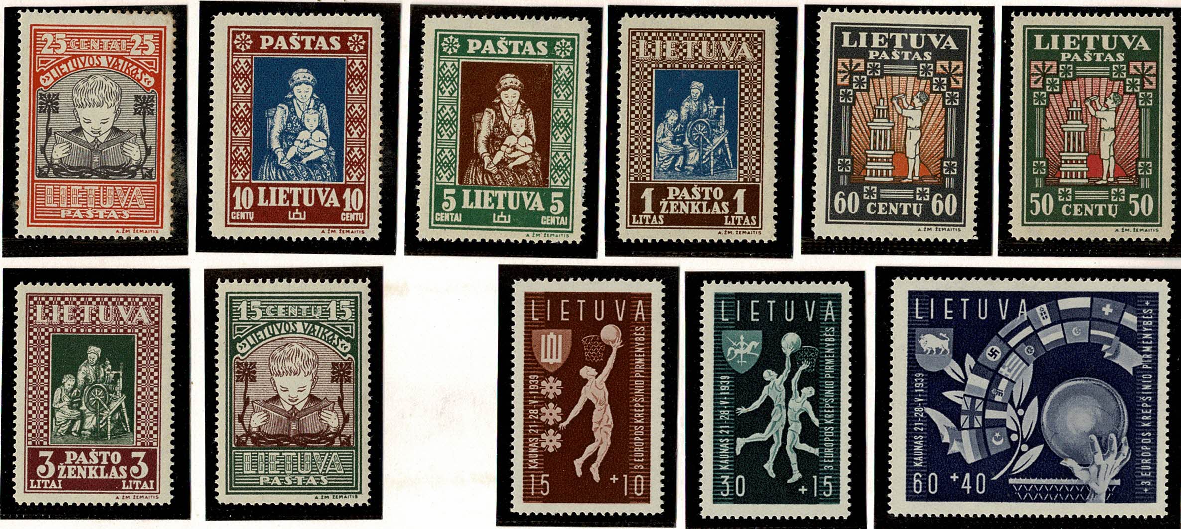 LITHUANIA **/* 327/334 série completa, 1 selo *, demais ** e 370/372 completo, limpos e só com charneira, sem ferrugem – 64 Euros