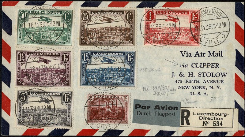 LUXEMBRUGO – Ano 1939 – Envelope circulado para Nova York, a bordo do Clipper (Hidroavião) e porteado com a 1ª série aérea completa (Yvert 1/6) + Yvert 158. Carimbo de chegada no destino. Qualidade e origem europeia