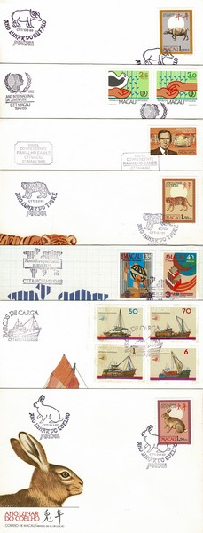 MACAU – Anos 1985/1988 – Lote com 7 diferentes Fdcs. Selos Yvert 505, 506/507, 508, 519/522, 523, 540 e 575/76. Valor dos selos sem carimbo: 72 Euros