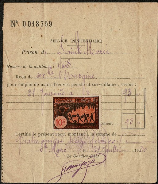 MADAGASCAR – Ano 1930 – Recibo de serviço efetuado por Prisioneiros (Prisão de Santa Maria) – Mão de Obra Penal – Selo fiscal alusivo.
