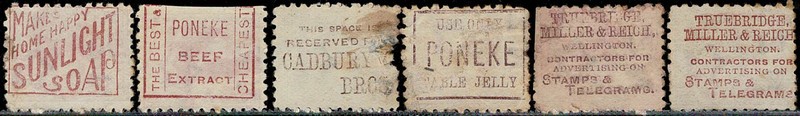 NOVA ZELÂNDIA ◉ PROPAGANDA IMPRESSA ATRÁS – Lote com 6 selos, com 5 diferentes propagandas impressas atrás dos selos clássicos. Qualidade mista