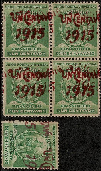 PERU – ◉/(*) 152 – Lote com 2 variedades na sobrecarga: Totalmente deslocada na horizontal (isolado e usado) e dupla (em quadra – novo sem goma).