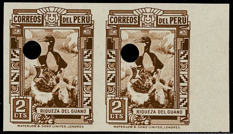 PERÚ – ** Yvert 335 (Ave) PROVA dos arquivos da firma empresora Waterlow & Sons – Par horizontal sem picote, com furo de segurança. Cor definitiva ..