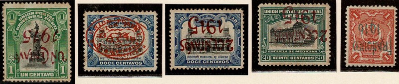 PERÚ – (*)/* 5 DIFERENTES VARIEDADES NA SOBRECARGA/SOBREESTAMPA – 4 Invertidas e 1 Dupla, entre selos Yvert 151 e 168.