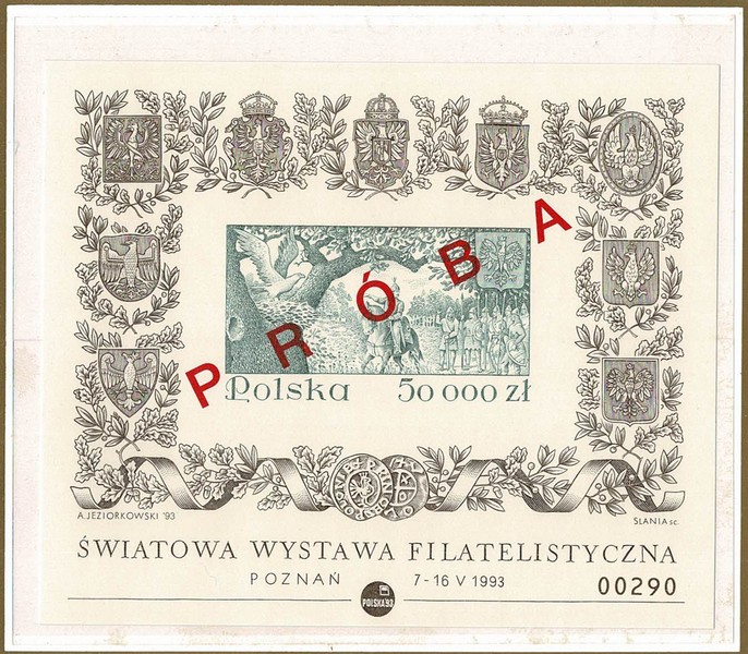 POLÔNIA ** Bloco 132a – Folder numerado (nº 290) contendo o bloco picotado, ele sem picote e com sobreestampa PRÓBA. Todos com a mesma numeração do folder, cuja tiragem foi só de 700 exemplares