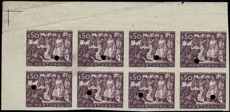 PORTUGAL (*) Yvert 698 – 8º Centenário da tomadas de Lisboa dos Mouros . Bloco de 8 horizontal, canto superior esquerdo de folha, sem picote e com furo de segurança individual. PROVA na cor definitiva. Vinco na margem superior, não atingindo nenhum selo