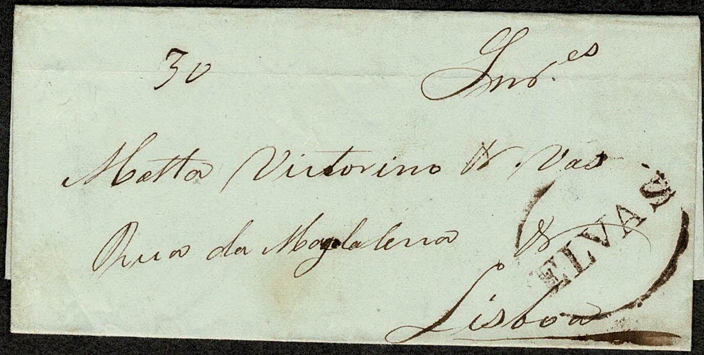 PORTUGAL – Ano 1849 – Sobrecarta pré filatélica, completa, circulada de Elvas para Lisboa, com chegada. Taxa 30. Carimbo de origem com cercadura ovalada. Muito boa conservação