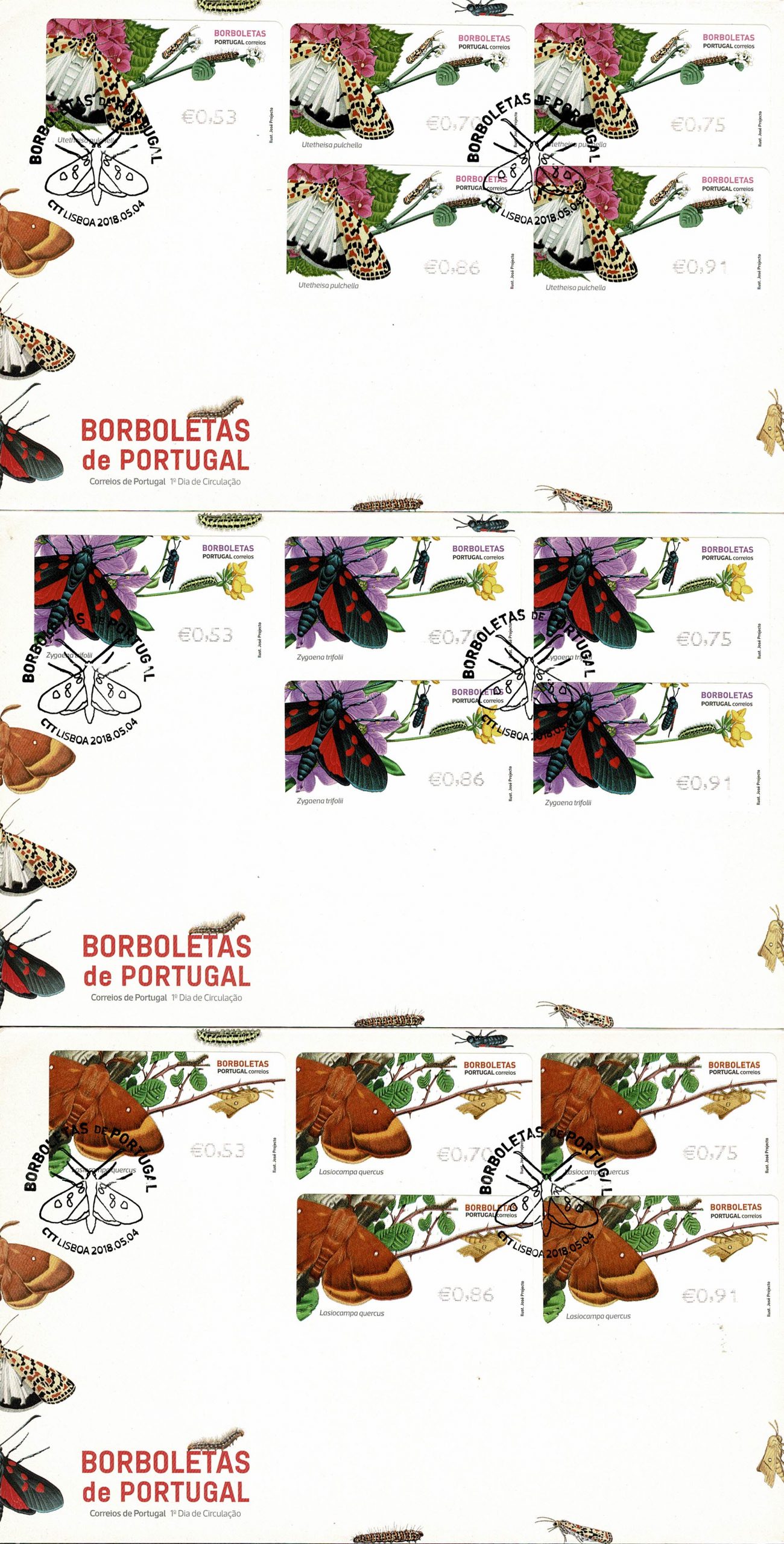 PORTUGAL – Ano 2018 – AUTOMATOS – 3 Fdc’s com série completa Nunfil 75 (total 15 automatos) Temática Insetos/Borboletas. Só de facial temos 11,25 Euros.