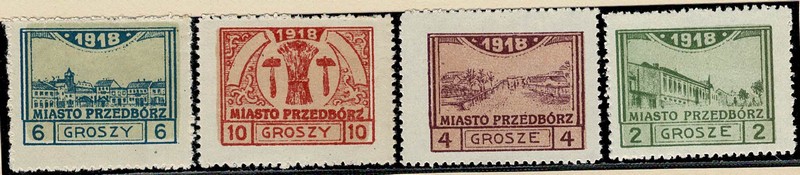 * PRZEDBORZ (Polonia Local – 1ª Guerra) Michel e Fischer 3/6 – Série completa picotada. Limpos, só com marca de charneira e sem ferrugem – 132 Euros.