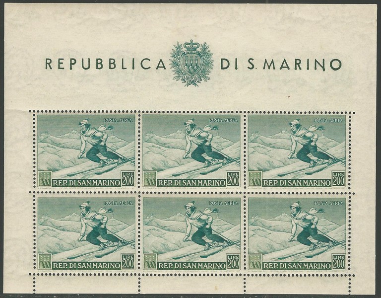 ** SÃO MARINO – Aéreo 100 (Esporte) – Mini folha com 6 exemplares – 740 Euros Yvert e 1.600 Euros Sassone.