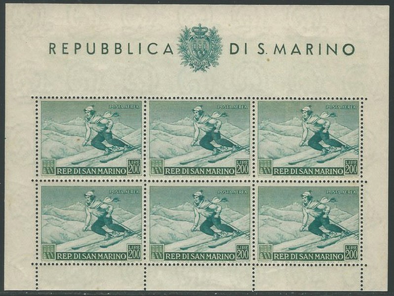 **/* SÃO MARINO – Aéreo 100 (Esporte) Mini folha com 6 exemplares – 1.600 Euros pelo Sassone.