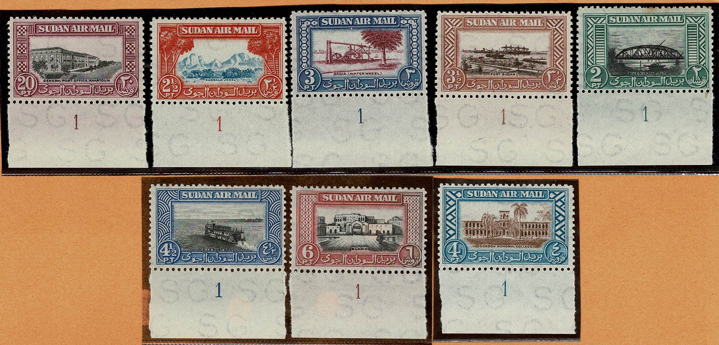 SUDÃO ** Aéreos 33/40 (só o 1º valor com ferrugem na parte superior) todos margem inferior de folha e Serviço Aéreo 1/8 – Ambas completas – 62 Euros …