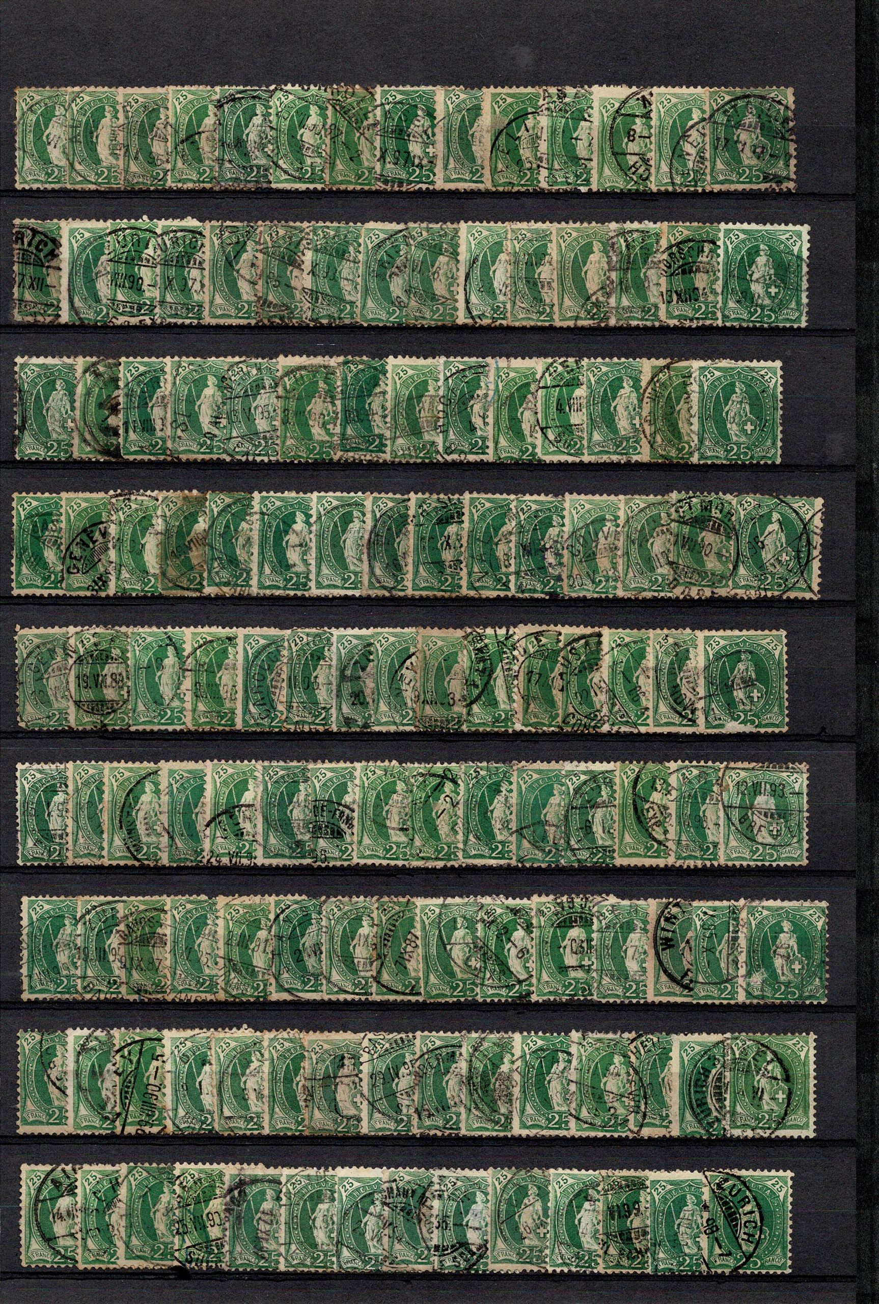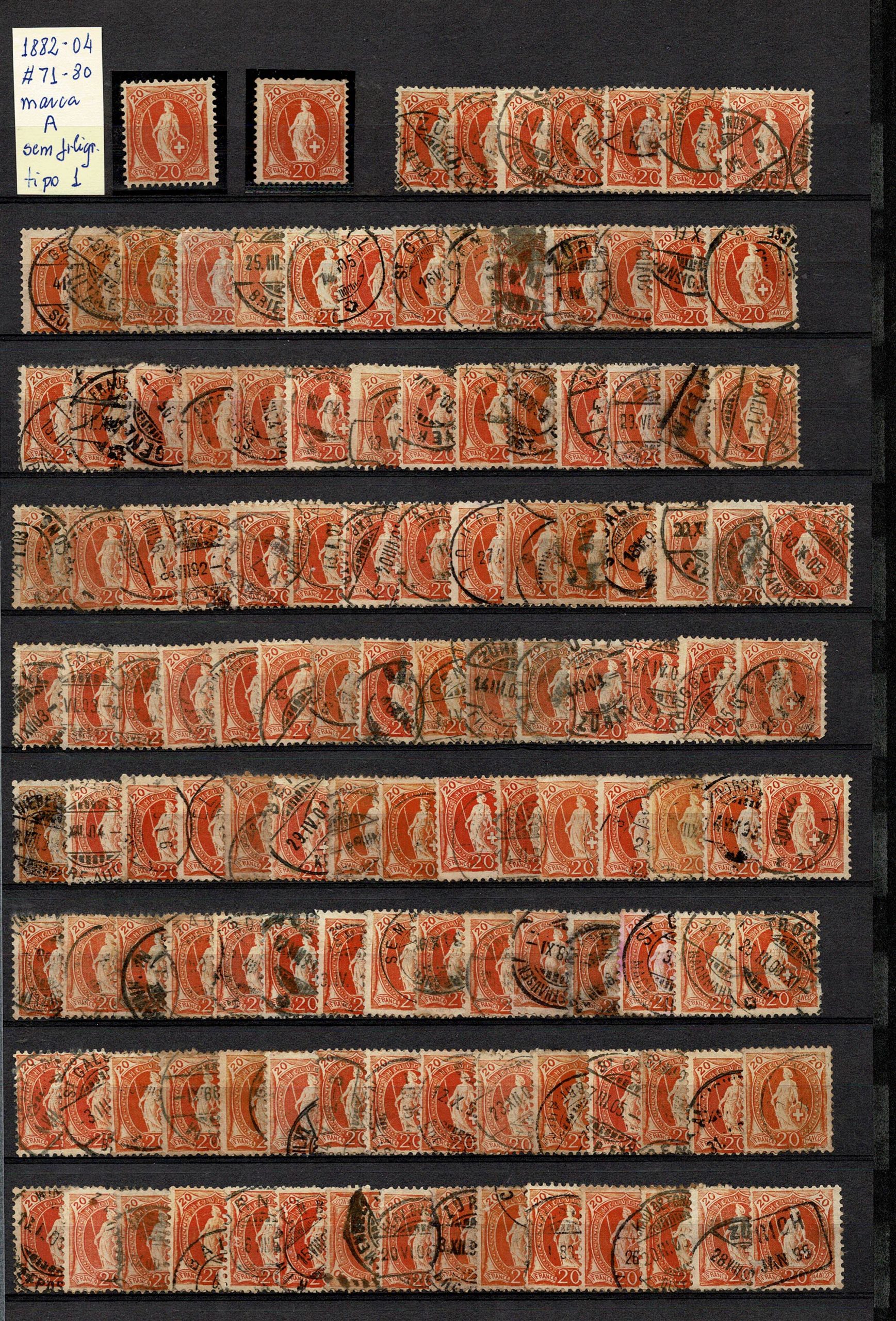 SUIÇA – ◉ EMISSÃO HELVÉCIA DE PÉ (ANOS 1882 a 1907) Estoque dentro de classificador importado de fundo preto (que vale fácil
