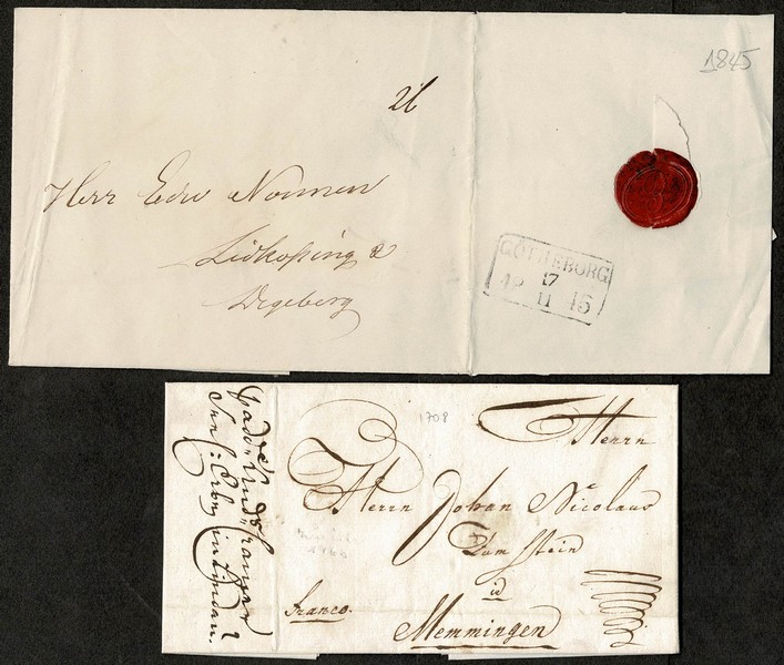 SUÍÇA – HISTÓRIA POSTAL – PRÉ FILATÉLICOS – 2 sobrecartas circuladas internamente, com carimbos e marcas à estudar. Anos 1708 ! (completa) e 1845