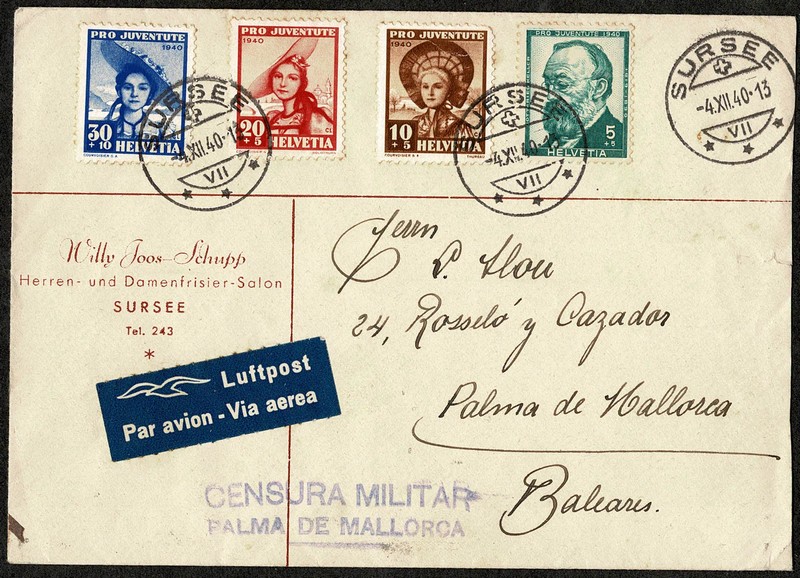 SUÍÇA – HISTÓRIA POSTAL – Ano 1940 – Envelope aéreo, censurado no destino, circulado para a Espanha, com chegada. Série completa Yvert 354/57 (Pró Juventude) ficando o selo nº 355 com defeito. Alguns pontos de ferrugem.