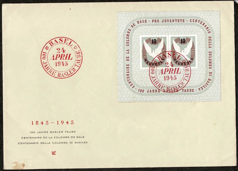 SUIÇA – Ano 1945 – Fdc com carimbo comemorativo e Bloco Yvert 12 que usado marca 110 Euros.