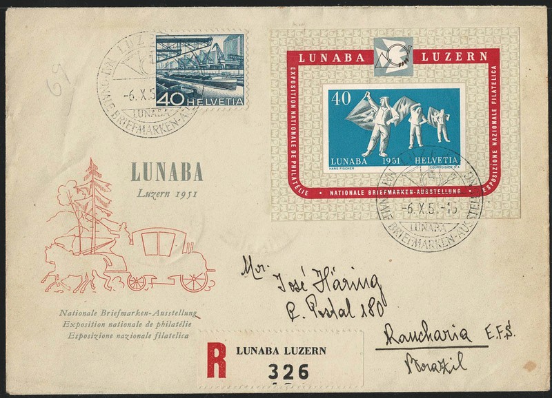 SUÍÇA – HISTÓRIA POSTAL – Ano 1951 – Envelope de 1° Dia (FDC) registrado, circulado para Rancharia (SP) com chegada. Bloco Yv 14 (Lunaba) com carimbo comemorativo alusivo. Acompanha selo regular – 325 Euros no catalogo Michel.
