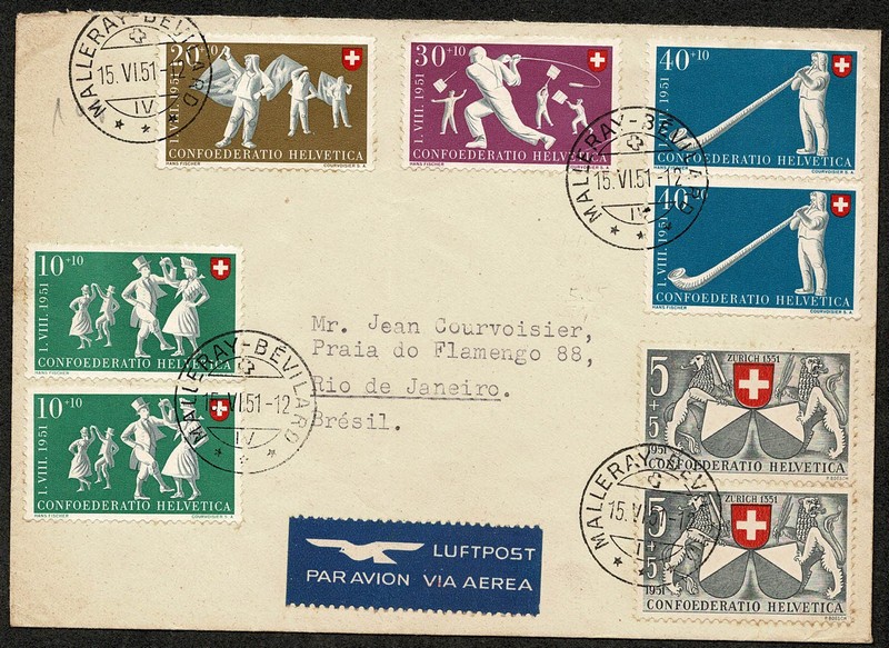 SUÍÇA – HISTÓRIA POSTAL – Ano 1951 – Envelope circulado para o Rio de Janeiro. Selos Yvert 507 x 2, 508 x 2, 509, 510 e 511 x 2. Vinco e poucos pontos de ferrugem.
