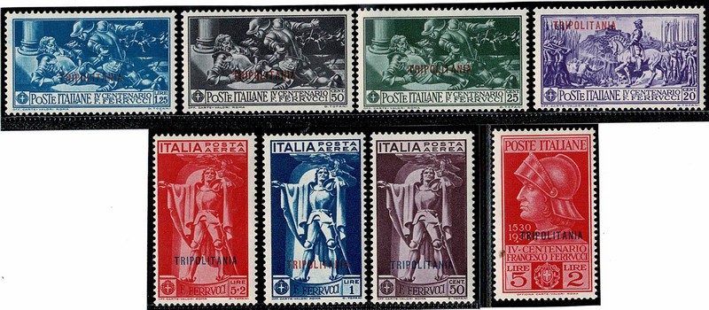 TRIPOLITANA – * Sassone 64/68 e Aéreos 1/3 – Yvert 87/91 e Aéreos 1/3 – Limpos, sem ferrugem e só com charneira – 90 Euros pelo catálogo Sassone de 2004