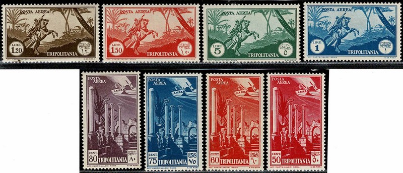 TRIPOLITANA – * Sassone Aéreos 9/16 – Yvert Aéreos 8/14 – 2 selos com pontos de ferrugem, demais limpos, sem ferrugem e só com charneira – 120 Euros pelo catálogo Sassone de 2004.