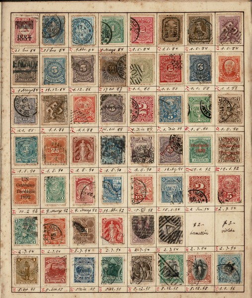 URUGUAI ◉ SÉCULO 19 – Pequeno conjunto composto com 133 selos DIFERENTES com e sem carimbo, quase todos do século 19 (antes de 1900) Afixados com charneiras de papel em antigas folhas de caderno artesanal. Qualidade mista
