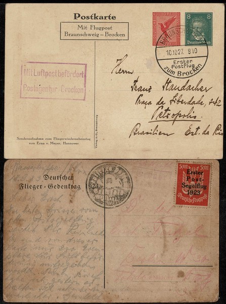 AVIAÇÃO – Anos 1923 e 1927 – ALEMANHA REICH – 2 peças circuladas internamente e com carimbos de 1ºs Voos: Ano 1923, alusivo ao 1º Voo de Planador, com selo Michel Ia, mas o endereçamento bem apagado e 1927, Inteiro Postal privado com carimbo alusivo ao 1º Voo entre as cidades de Braunschweig e Brocken (este endereçado à Petrópolis) mas sem chegada.