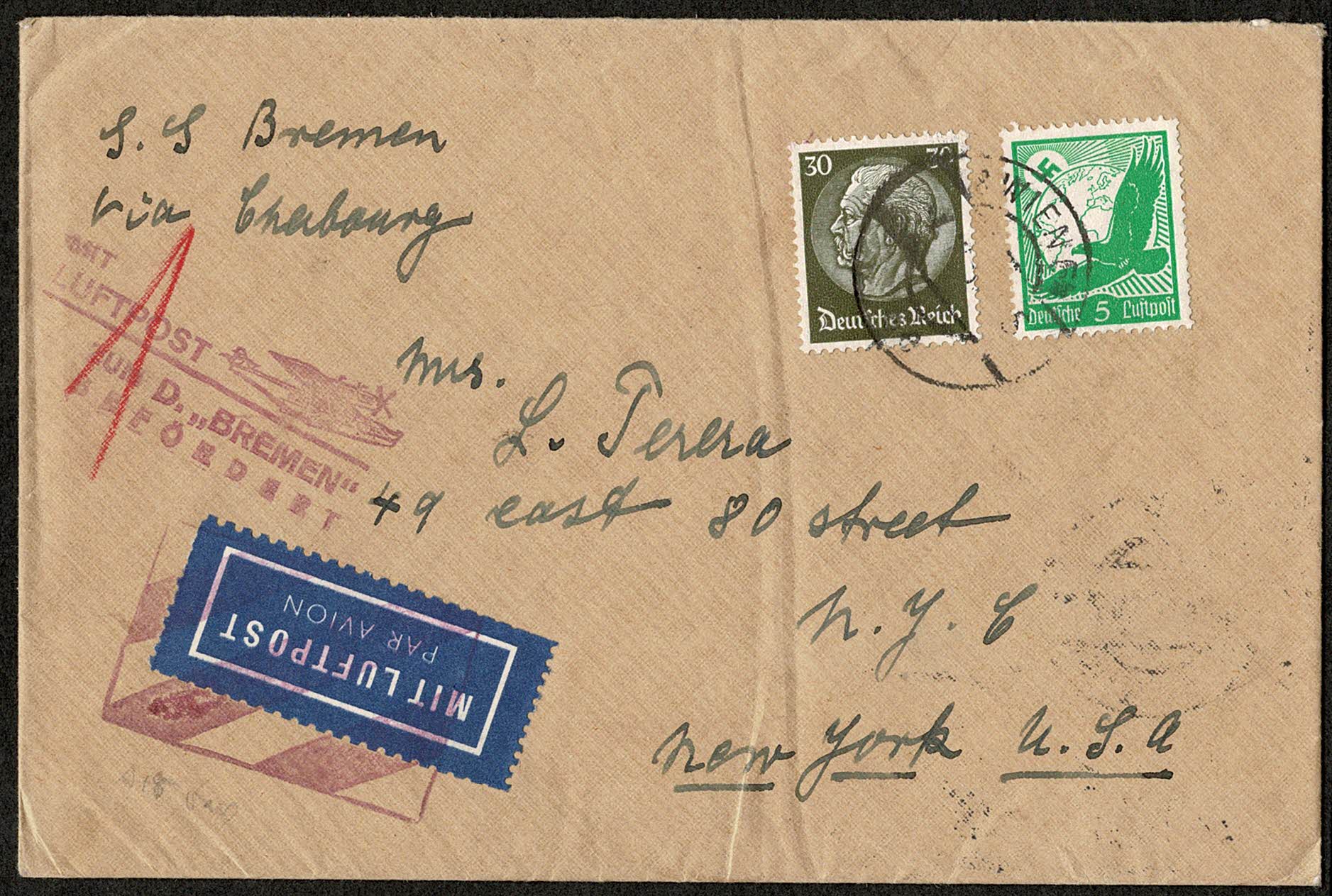 AVIAÇÃO – Ano 1939 – Austria (durante a Ocupação Alemã) envelope circulado para os Estados Unidos e com carimbo alusivo ao vôo catapultado do “D. Bremen” – 2 selos regulares da Alemanha Reich. Discreto vinco vertical.