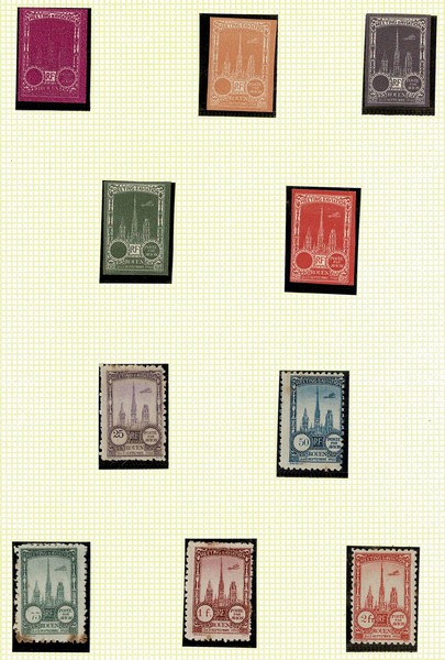 AVIAÇÃO **/* França – Ano 1922 – Meeting de Aviação – Rouen – Selos Privados – 10 diferentes selos, sendo 5 Provas de cor sem picote e sem o valor facial a série “normal” com 5 selos. Vide imagem na web – Parte consta do catálogo Sanabria