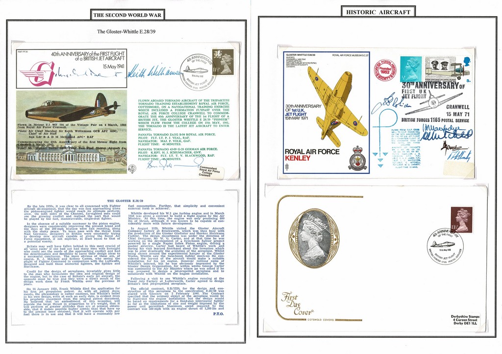 AVIAÇÃO – Coleção estrangeira, contendo artigos, fotos, recortes, selos e peças filatélicas e intitulada “Franck Whittle and the Early Jet Aircraft”, em uma pasta.