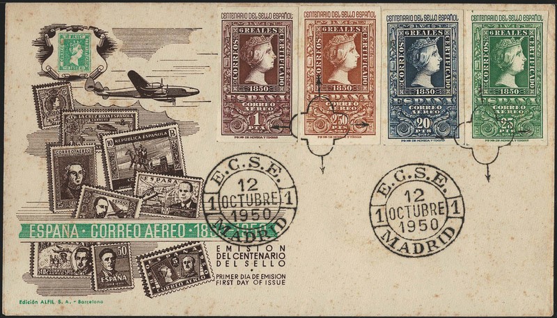 CENTENÁRIO DO SELO – Espanha – Ano 1950 – 2 Fdc’s com série completa Yvert 802/05 + Aéreos 242/245 – 570 Euros para a série usada. Alguns pontos de ferrugem..