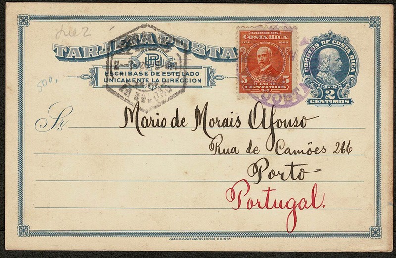 COLOMBO – Costa Rica – Ano 1920 – Inteiro Postal tipo cartão, com facial de 2 centimos + selo regular, circulado para Portugal, com chegada