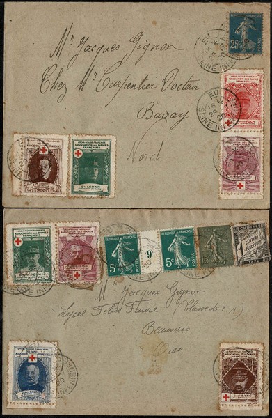 CRUZ VERMELHA – França – Ano 1920 – 2 envelopes circulados internamente com chegada. Selo/Selos Postais 4 diferentes etiquetas Pró Cruz Vermelha e com carimbo amarrando. Vide imagem………