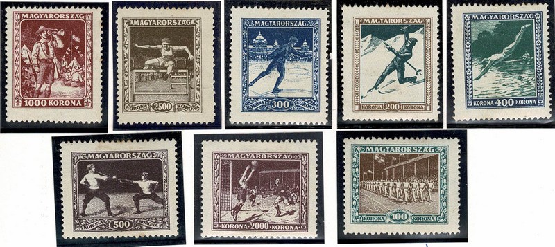 ESCOTISMO * HUNGRIA – Ano 1925 – Série completa Yvert 371/378. Incluso outras modalidades esportivas: Esgrima, Futebol, Nado, Patinação, Atletismo etc – 1 selo sem goma no meio.