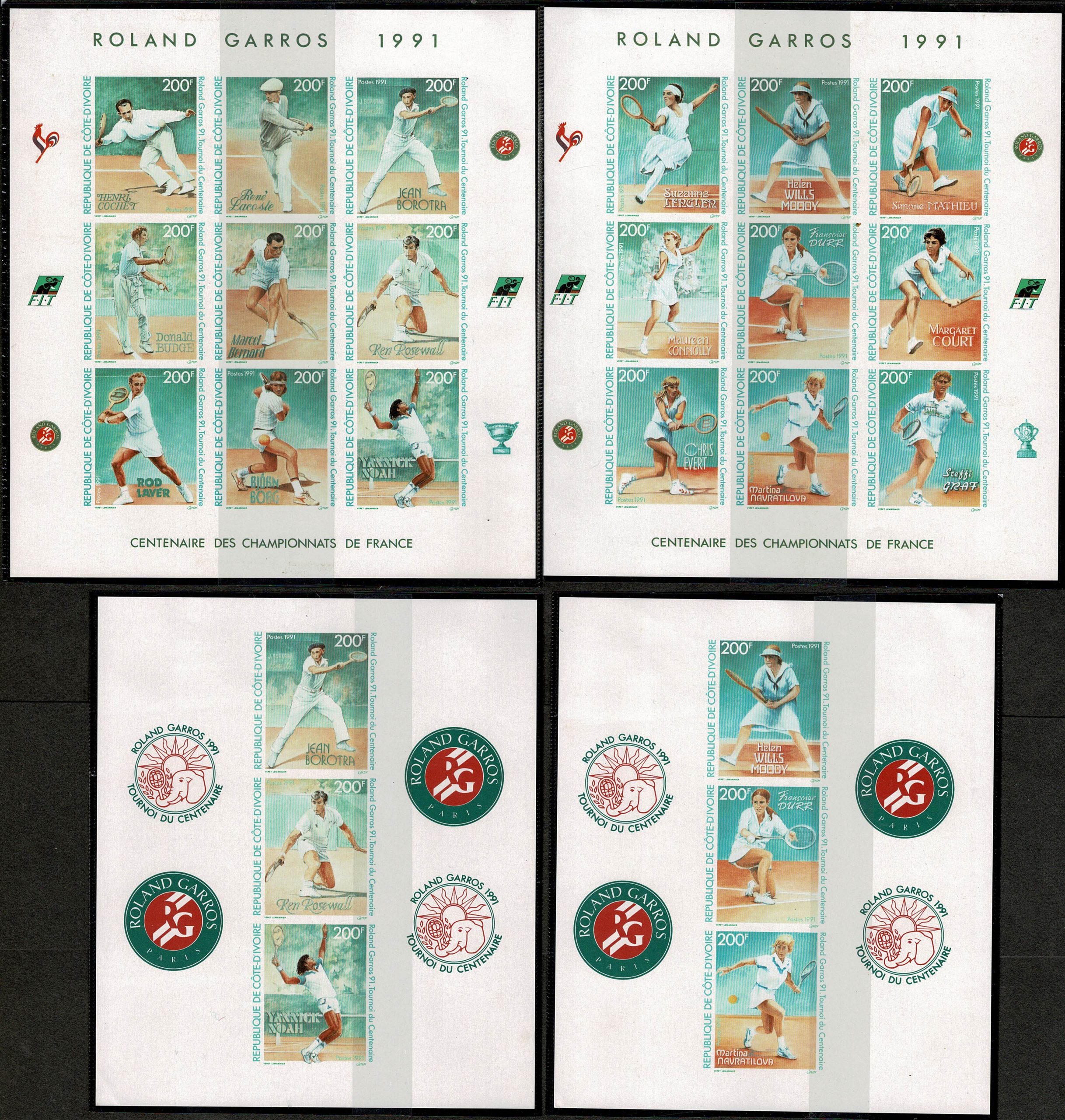 ESPORTES ** Costa do Marfim – Ano 1991 – Yvert 854/862 e 863/871 (Tenis de Campo) Série completa em mini folhas SEM PICOTE e 2 blocos com 3 selos, também SEM PICOTE (que sequer constam dos catálogos Yvert e Michel).