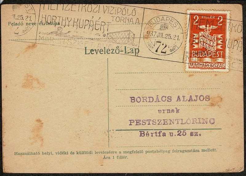 ESPORTES – Hungria – 1937 – Cartão com carimbo tipo mecânico, alusivo à Polo Aquático. Deve ser um dos primeiros carimbos alusivos.