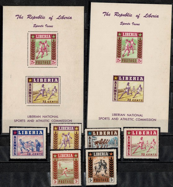 */** ESPORTES – Libéria – 1955 – Yvert 325/7 + Aéreos 86/88 e Bloco 7 (com e sem picote) – 56 Euros.