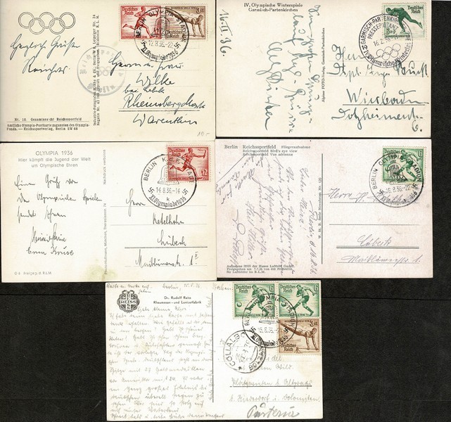 ESPORTES – OLIMPÍADAS – Ano 1936 – Alemanha Reich – Lote com 5 cartões Postais, sendo 3 figurando o Estádio Olimpico e 1 a pista de gelo da parte de Inverno. Todos com selos e carimbos alusivos. Aparentemente todos circulados. Excepcional qualidade.