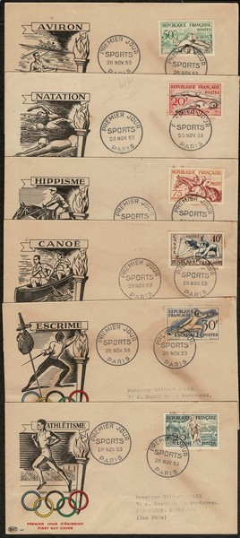 ESPORTES – Olimpíadas – Ano 1953 – França – 6 Fdcs com série completa Yvert 960/965 (Jogos Olimpícos de Helsinki) Pontos de ferrugem – 100 Euros.