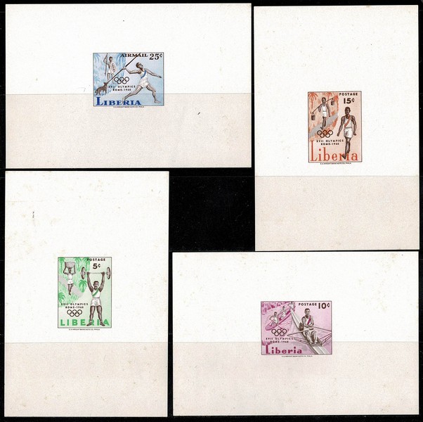 ** ESPORTES – Olimpíadas – Ano 1960 – Libéria – Série completa Yvert 368/370 e Aéreo 122 em espécies de PROVAS individuais na medida 11,5x8cm