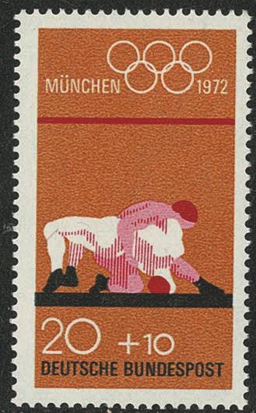ESPORTES (SÓ OLIMPÍADAS) ** Ano 1972 – Alemanha Federal – Michel 719 (luta) Dupla impressão da cor preta – Expertizado Dr Angel. Não listado no Michel.