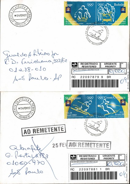 ESPORTES – OLIMPÍADAS – Ano 2002 – Brasil – Olimpíada de Inverno – Lote com 70 envelopes, todos REGISTRADOS, circulados internamente e porteados sempre com 2 selos da série RHM 2441/2444 (vide imagem) Aqui pedimos só R$ 2 cada. Hoje, o registrado + barato, tem um custo de quase R$ 15 (Cerca de R$ 1.000 atualmente)