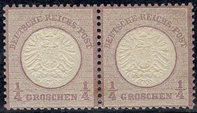 * 16 – Bonito par horizontal, com pequena mancha de ferrugem entre os selos – 220 Euros.