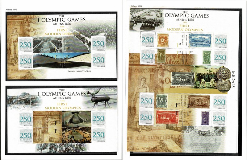 ESPORTES (SÓ OLIMPÍADAS) ** Ano 201 ? – Grenada – Imagem bastante similar ao lote acima, agora são 2 folhas decoradas com 8 selos em cada, sendo 1 alusiva às olimpiadas de 1896 + 2 Blocos e a mesma quantia alusiva à olimpíada de 1920. Como eles ainda não constam na edição do nosso catálogo Yvert, não sabemos a cotação e nem se estão completos ou não.