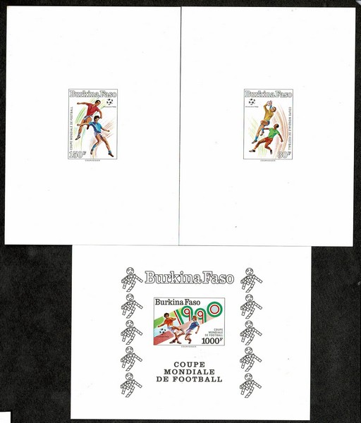ESPORTES – FUTEBOL ** Burkina Faso – Ano 1990 – Yvert 818/819 + Bloco 38 (Copa do Mundo) Série completa em “Provas” medindo 11x8cm.
