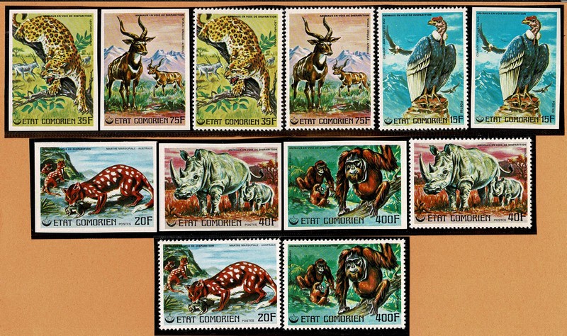 FAUNA **/* Comores – Ano 1976 – Michel 325/330A e B (Animais Selvagens) – Série completa com e sem picote – Sem cotação para sem picote – 4 selos com pontos de ferrugem